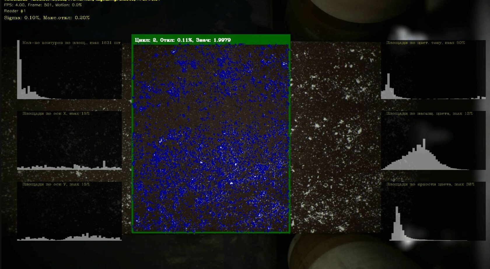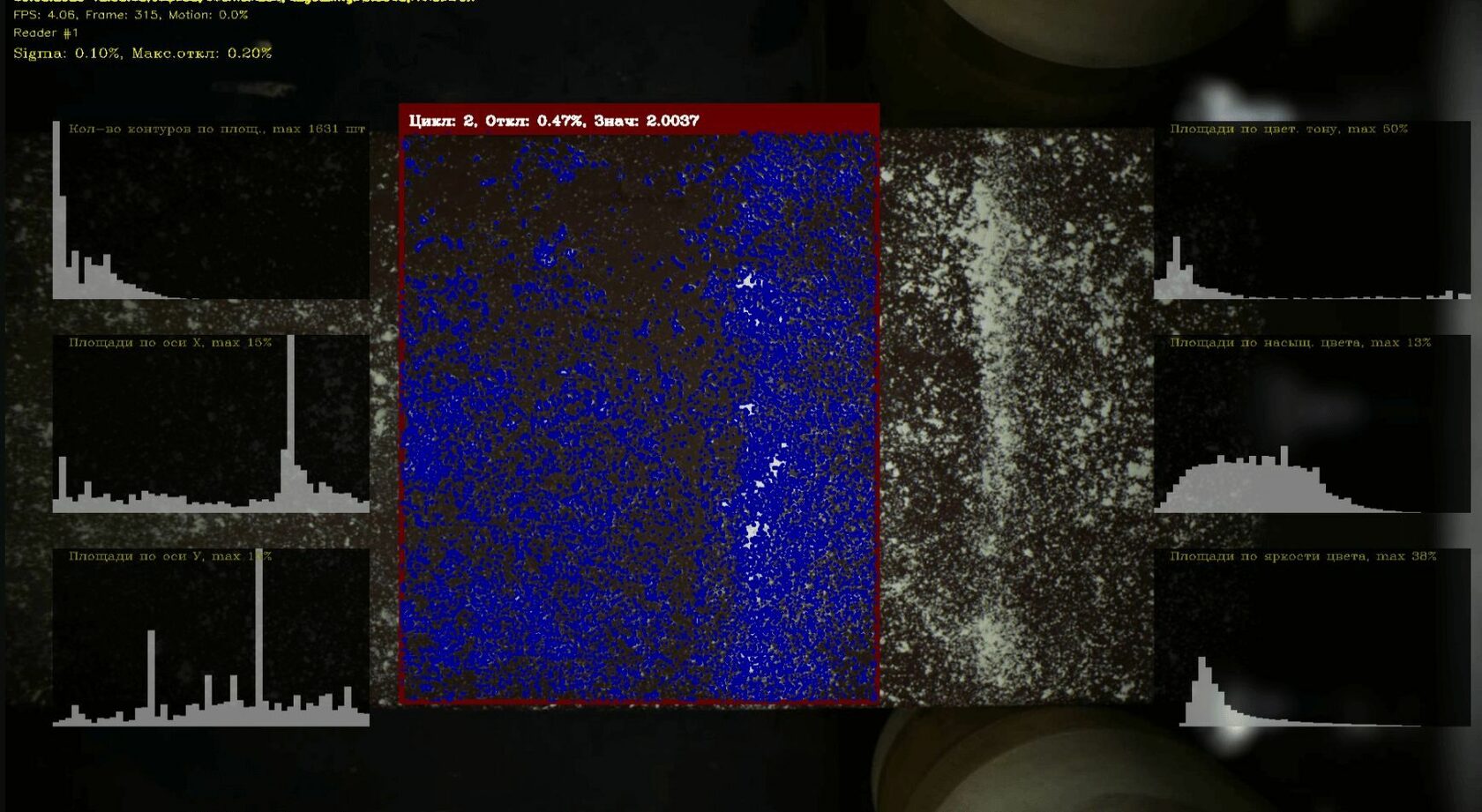 Мониторинг и вывод на мониторе расположенном на линии, а также в web-интерфейсе системы в режиме реального времени текущего отклонения от установленной (обученной ранее) эталонной модели. Возможность просмотра в интерфейсе архивных данных.